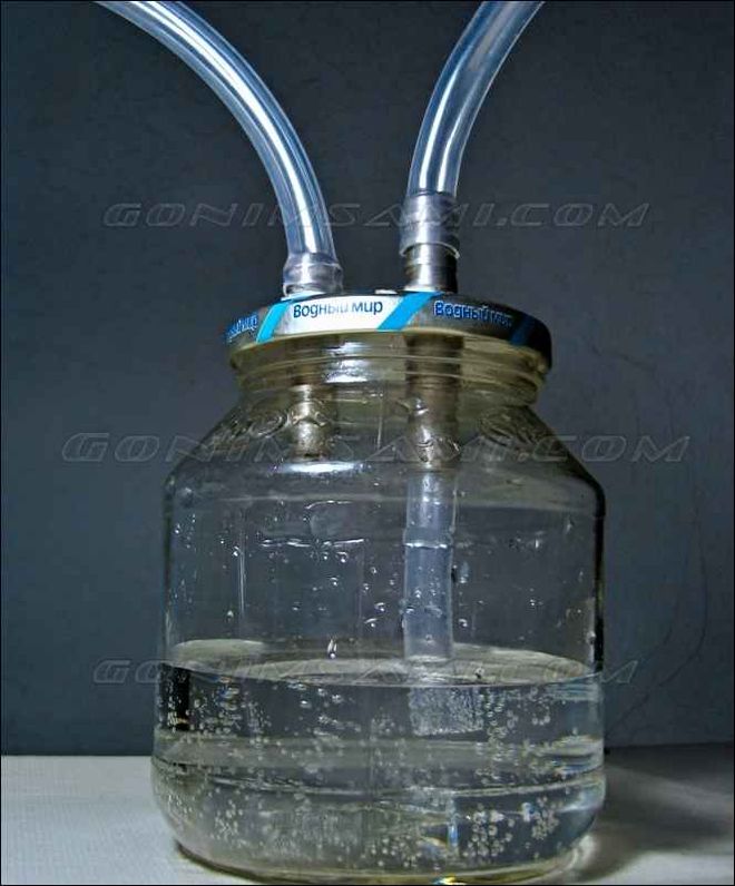 Принцип следующий: в крышке ёмкости вырезается отверстие под трубочку. С помощью пластилина заделываются щели и крепится трубка. Далее, она опускается в ёмкость с водой. Углекислый газ в результате брожения скапливается в ёмкости, выходит через трубочку в воду и пузырьками удаляется. Внутрь, за счёт воды, воздух не проникает.