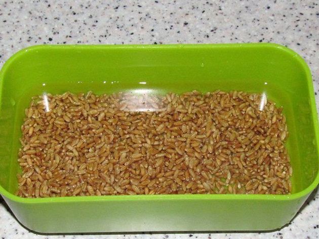 - В широкую пластмассовую тару засыпьте 250 грамм зерна, залейте его водой, чтобы покрыть на 1–2 см, и прикройте крышкой. Если объёмы большие, то используйте несколько ёмкостей. В течение 2–3 суток зёрна прорастут.