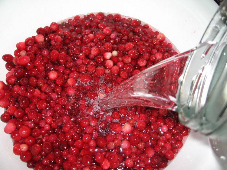 - промываем 0,5 кг клюквы, заливаем кипятком, месим руками;