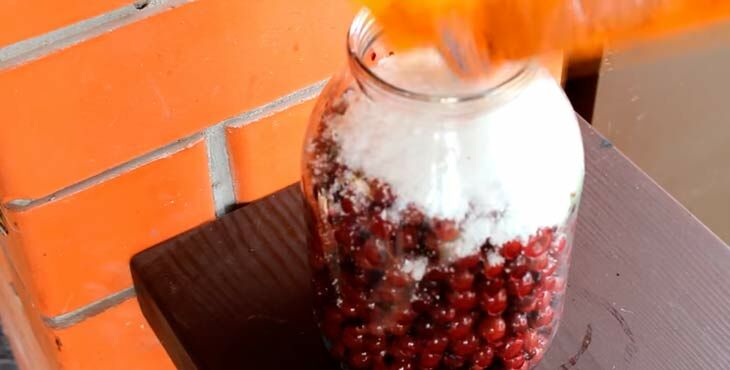 - Очищенные и промытые ягоды пересыпаются слоями с сахаром, тем самым заполняется 3-х литровая банка на 2/3 (последний слой – сахар).