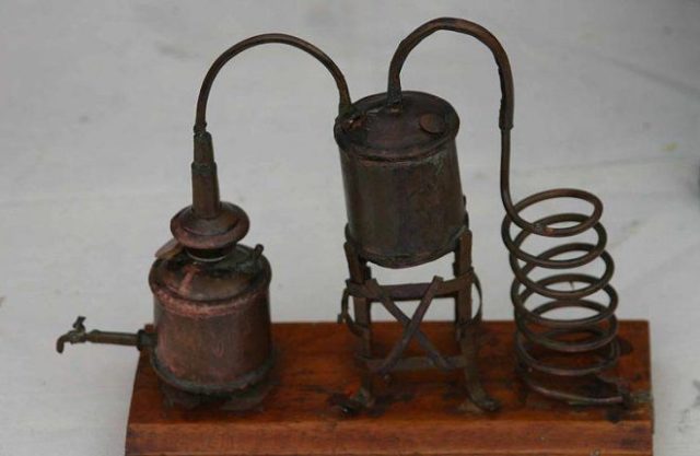 - Увидев первый «туман» в трубке, убавьте огонь и покапельно отберите первые 10% дистиллята от чистого спирта.