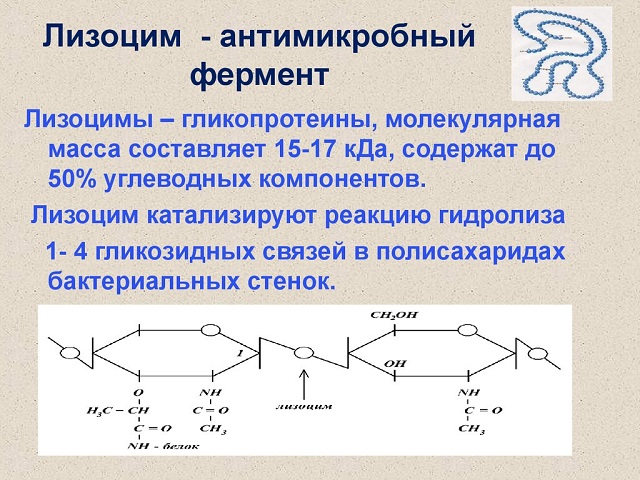 Лизоцим – это вещество, относящееся к классу природных антибактериальных ферментов. В фармацевтических целях его извлекают из белков куриных яиц. Фермент лизоцим также является безопасным пищевым консервантом. Вещество естественным образом находится в определенных органах и тканях человеческого тела, включая слизистые оболочки желудочно-кишечного тракта. Он состоит из триптофана, а также содержит 129 аминокислот, хлоридов и лактатов.