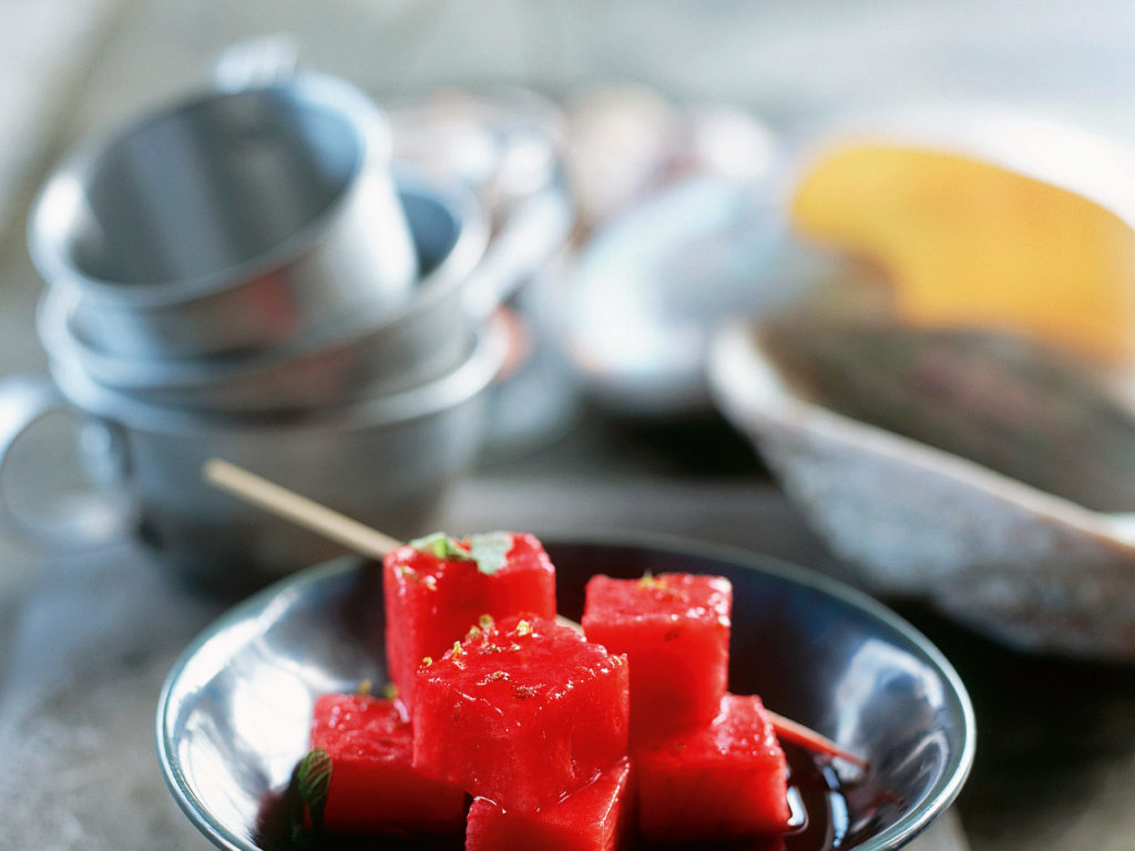 Мятный нардек можно использовать как необычную начинку во фруктовых салатах и десертах, а также как добавку к горячему чаю холодными зимними вечерами. В этом рецепте используется не только арбузный сок, но также сахар и свежая мята с тимьяном.