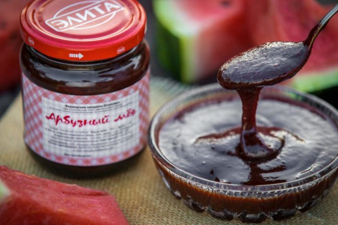 Что такое арбузный мед, как называется это лакомство? Его получают из мякоти этой ягоды, из которой выжимают сок, а затем варят на огне до загустения в несколько этапов. Удивительно, что сахар и другие добавки для приготовления пищи не нужны, как видите, пчелы здесь абсолютно не играют, поэтому «арбузный мед», в принципе, неправильное название. Но поскольку в народе прижилось, в народе до сих пор так называют это лакомство. Вероятно, этот продукт был чем-то похож по консистенции на обычный пчелиный мед.