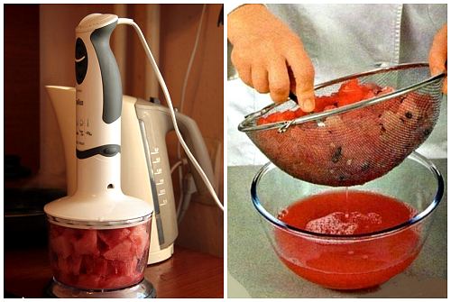 - Мякоть арбуза измельчить, процедить через сито, чтобы удалить прожилки и семена.