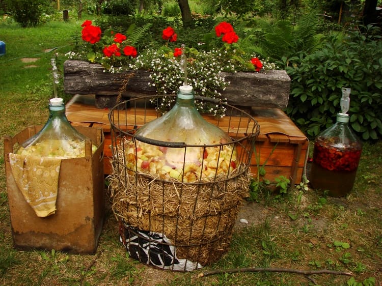 - Закрываем баллон, можно поставить гидрозатвор, будет еще лучше. Едем на месяц бродить в тёплое и тёмное место. Периодически проверяем, как идет реакция. Затем процедить сусло, яблоки отжать, использовать по назначению.