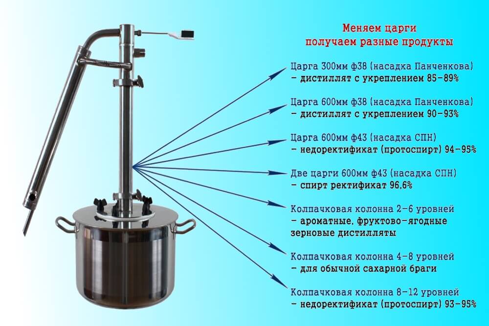 Зарга играет роль сосуда, в котором происходит тепло- и массообмен: пары нагреваются и укрепляют мокроту, спирт очищается и мокрота укрепляется. Фракции разделены и расположены в порядке от низкой точки кипения до высокой точки кипения, чтобы вы могли их выбрать. Диаметр, длина, металл – все влияет на скорость работы аппарата и качество разделения спиртов. Так, например, к шлифовке рекомендуются колонны с высотой боковой стенки 50 см. Чем выше царь, тем больше возможностей разделить и укрепить колонну.