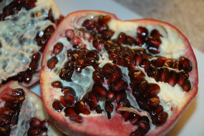 1. Для начала нужно выбрать хорошие гранаты, не дряблые и не зеленые. Вымойте их и разрежьте пополам. Аккуратно разбейте на мелкие кусочки.