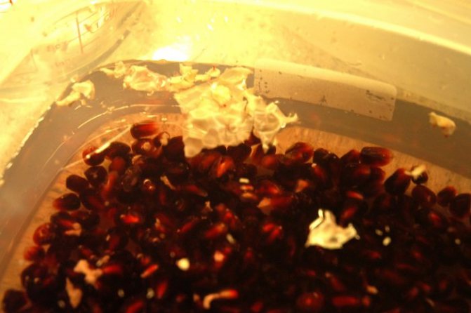 2. Набрать холодную воду в глубокую миску и отправить туда измельченный гранат. Просто в воде можно все время отделять зерна от кожицы. Рецепт гранатового сиропа начинается с этого процесса, чтобы удалить любые пленки, которые могут сделать сироп горьким. Зерна осядут на дно, а легкие пленки будут просто плавать. Их нужно аккуратно удалить дуршлагом. После зерна тщательно промыть.
