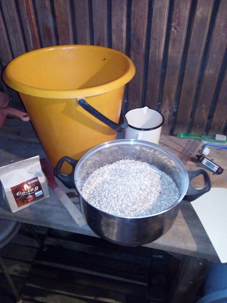 - В воду, разогретую до 70 градусов, залить солод и крупы.