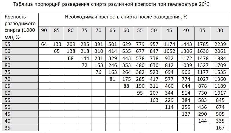 Разновидности и таблица соотношения воды и спирта