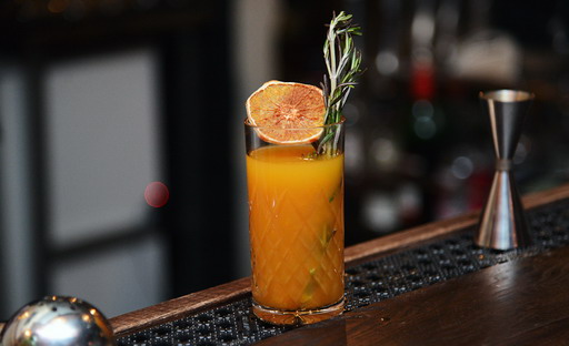 Перемешайте напиток барной ложкой и украсьте край стакана долькой апельсина или лимона.