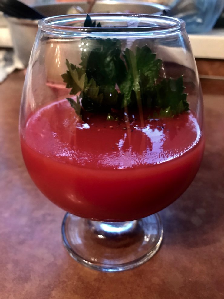 - На дно побега капают острый соус и наливают томатный сок, смешанный с солью и перцем.
