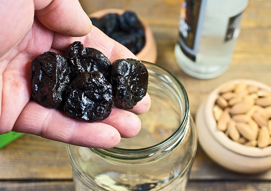 - 3 литра самогона крепостью 45 ° следует разделить на 2 части, в одну из которых с косточкой залить 700 г чернослива;