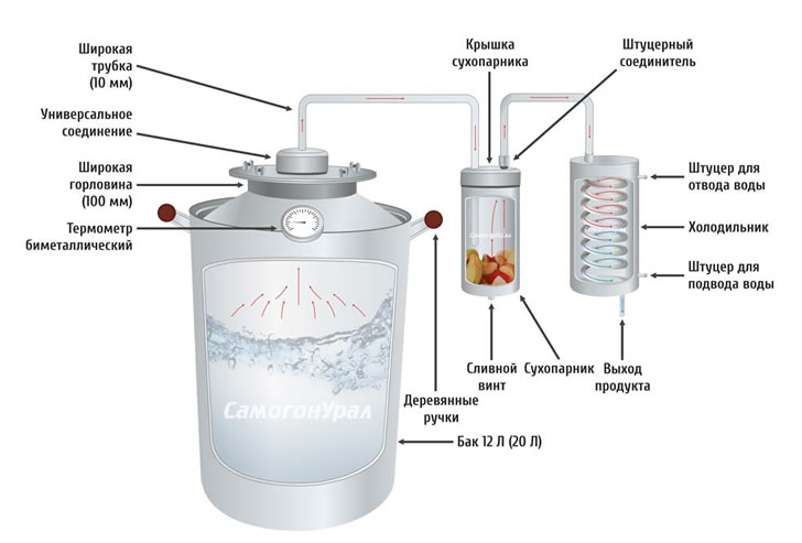 Сначала мы вкратце опишем основные элементы, которые содержит любая схема самогонного аппарата, еще оборудованного холодильником (наличие этого элемента значительно ускоряет процесс, поэтому рекомендуем даже не рассматривать чертежи устройств без принудительного охлаждения), а затем он будет объяснят вам, как сделать их самостоятельно и как добиться максимальной эффективности и долговечности.