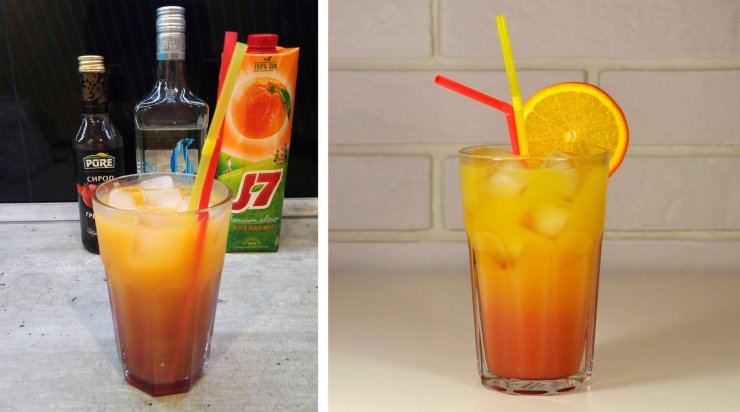 Это композиция Tequila Sunrise, которую часто подают в современных клубах и барах. Для его приготовления лучше использовать лучшие ингредиенты: гренадин должен быть качественным, апельсиновый сок можно заменить свежими фруктами.