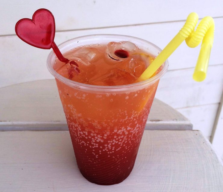это гренадин, который без смешивания с другими ингредиентами изображает яркое «солнце», меняющее цвет на желтый. Настоящий восход солнца в стакане!